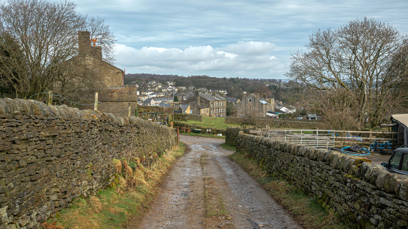| Looking back down the driveway to Green Well Farm with Lower Laithe Reservoir in the distance |